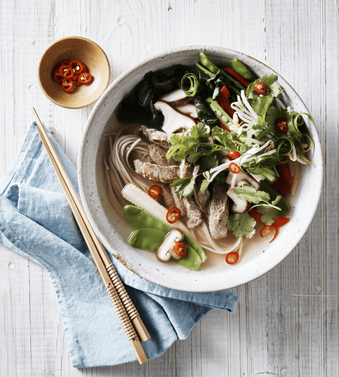 Divide noodles and cooked vegetables between bowls. Top with beef and ladle over hot broth. Serve topped with bean sprouts, chili, green onions and coriander.