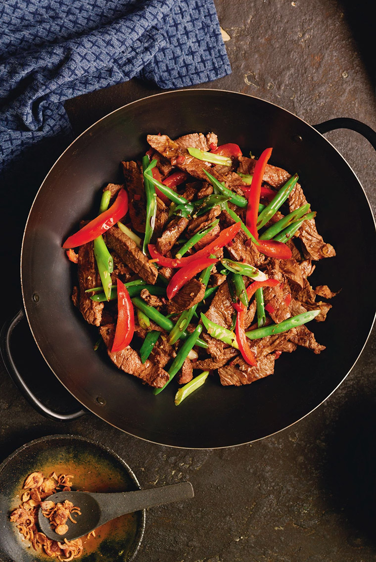 To cook: Add half the oil to the beef and mix well. Heat the wok, ensure it is hot. Stir-fry the beef in three batches, and set it aside. Reheat wok between each batch. Reheat the wok, add remaining oil, and add the ginger, lemongrass and spring onions. Stir-fry for 1 minute. Add the red bell pepper, beans and chili, stir-fry for 1-2 minutes. Return the beef to the wok and add the sherry and sauces. Stir for 30 seconds to combine.