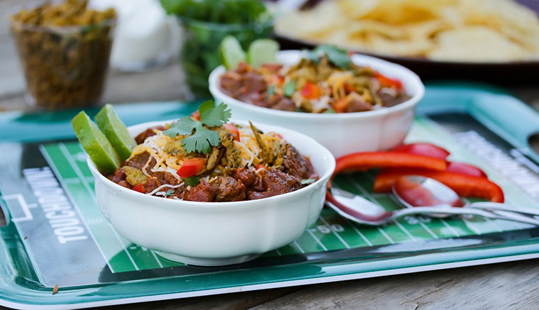 Set up Toppings Bar with bowls of cilantro, sour cream, green onion, grated cheese, crispy fried jalapeños, red bell peppers, corn chips, tortilla chips, red bell peppers, and any other ingredient to top and flavor boost your chili to a winning score. Serves 6 big bowls or 12 small appetizer cups for the fans.