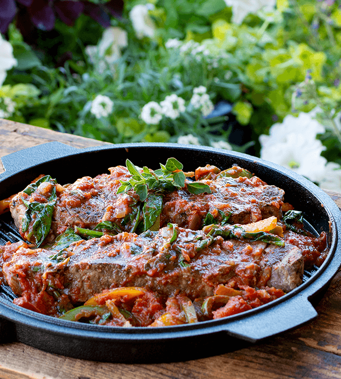 Sear each side of the steak for 1 minute. Remove the steak from the EGG when the internal temperature reaches 135°F/57°F. Let rest for 10 minutes. Serve steaks smothered in pizzaiola sauce