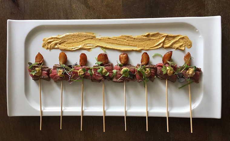To assemble: Slice the Australian beef tenderloin into 1/4 inch slices and then cut each slice in half squaring each side to match. Thread the beef tenderloin onto the grill stick. Add the roasted garlic onto the the end of the grill stick. Place a small dollop of curry mayo onto each piece of beef tenderloin. Garnish with micro greens and lime zest salad