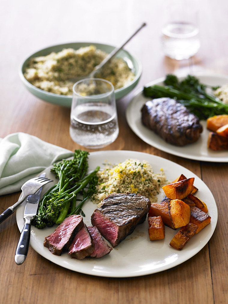 Charred Aussie beef sirloin, pumpkin, broccolini and herb couscous