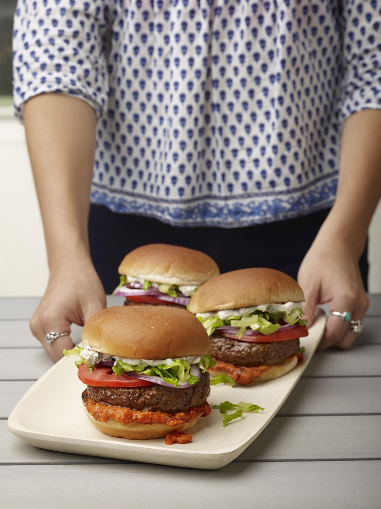 To prepare: Preheat a skillet over HIGH heat. Add the burger patties and press with a spatula to form a crust during cooking. Cook until browned on the bottom, then flip the burgers and continue cooking to the desired doneness (3-4 minutes per side for medium rare, 5-6 minutes for medium, 6+ for well done). Remove the burgers from the pan and add the burger buns, cut-sides down; toast until golden, about 1 minute. Build your burger in the following order: Potato bun bottom, 1 tablespoon tikka masala sauce, 1 hamburger patty, 1 tomato slice, 3 onion slices, and ½ cup shredded lettuce. Spread 1 tablespoon dill-lemon yogurt on the potato bun top and put it on the burger. Serve immediately with your favorite side dish.