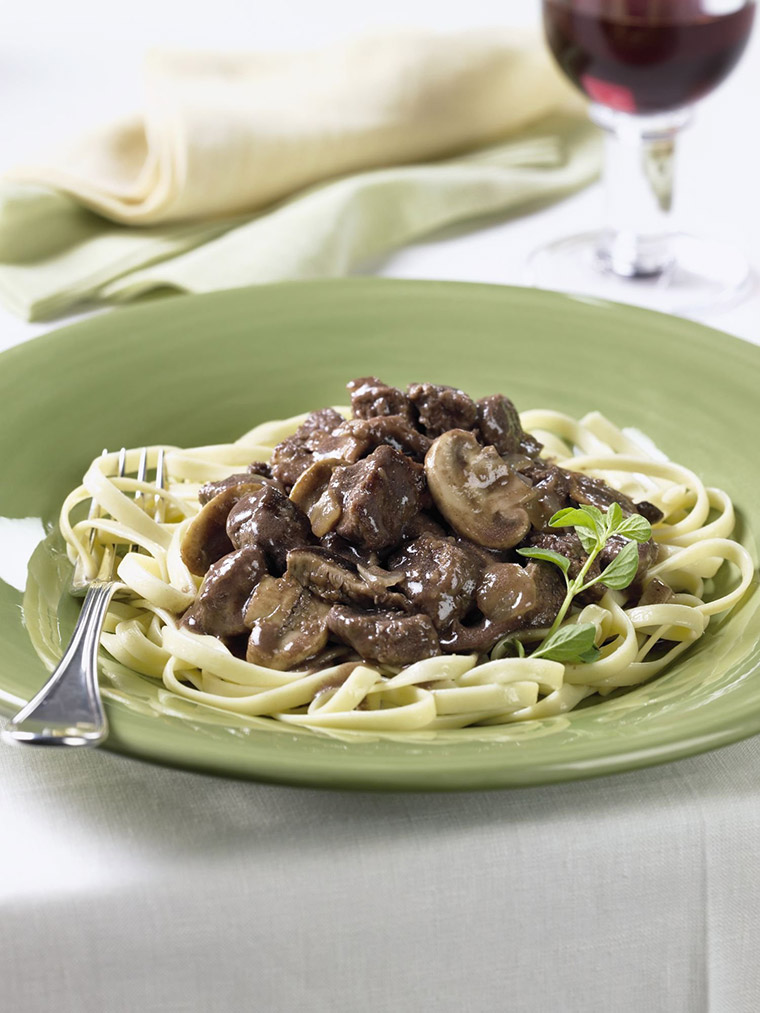 Add remaining oil and sauté onion and mushrooms 1 minute. Return meat to the pan with Chianti and balsamic vinegar and bring to a boil. Simmer 8-10 minutes or until beef is tender. Add the pasta to the pan and toss to coat.
