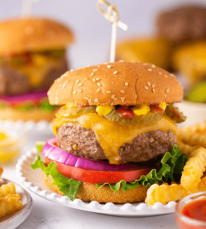 Air Fryer Burgers: To make these burgers in the air fryer, I suggest forming the meat into 8 smaller patties (instead of 6 bigger ones). Preheat your air fryer to 370. Cook in batches so the patties are not overlapping. Cook the patties for 6 minutes, then flip and cook for an additional 5 minutes. If topping with cheese, add it and cook for 1 additional minute.