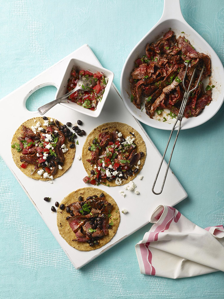 To serve: Heat the tortillas over the grill to soften. Divide the skirt steak evenly among the tortillas. Top each tortilla with 3 tablespoons black beans, 2 tablespoons pico de gallo, and 1 tablespoon cotija cheese. Serve immediately.