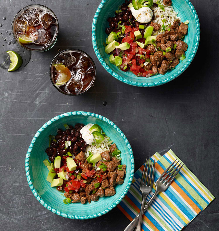 To serve: For each serving, place ½ cup of the cilantro rice in the bottom of a large bowl and top with one quarter (4 oz.) of the diced beef, ¼ cup salsa, ¼ cup black beans, one quarter of the avocado, 1 Tablespoon sour cream, ¼ teaspoon cumin, and 1 teaspoon scallion. Serve immediately.