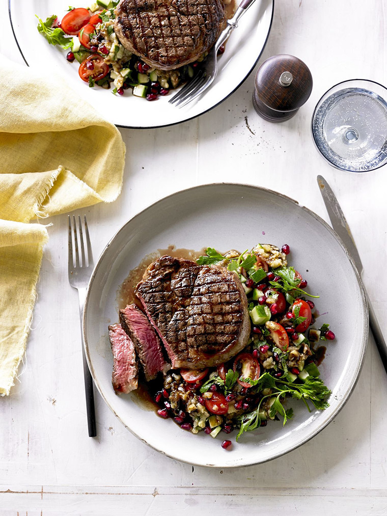 To cook: Cut a few deep slits in the eggplant and place directly over a gas flame using tongs (see tip if you don’t have a gas flame). Cook for 10 minutes, rotating as the skin chars and the eggplant softens. Remove to a tray and slice in half lengthways. Scoop flesh into a sieve set over a bowl and allow to drain for 20 minutes. 3. Preheat a barbecue or grill to very hot, season steak with salt and pepper and cook for 2-3 minutes per side for medium, then allow to rest.