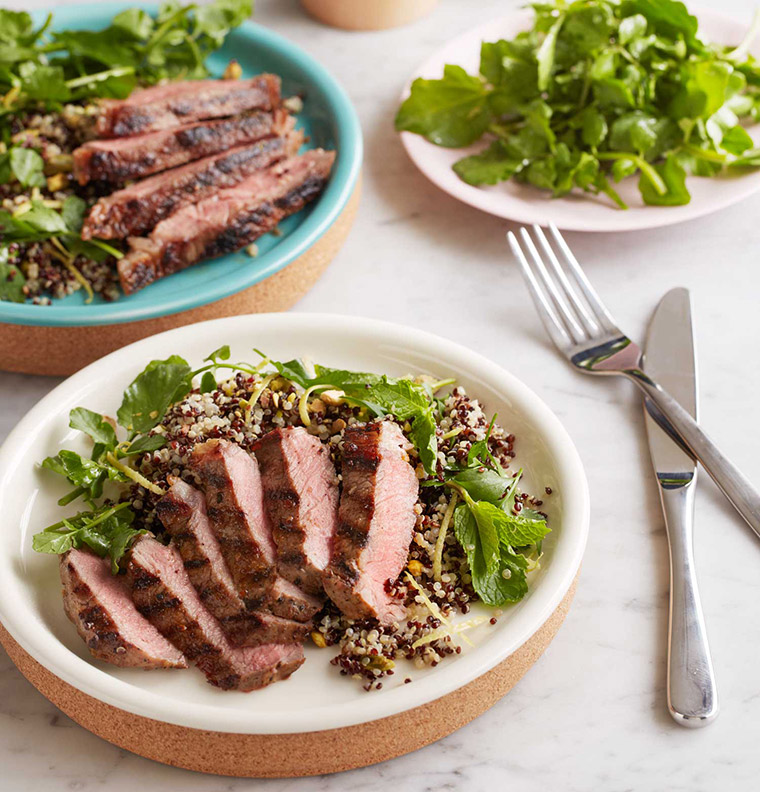 To serve: Slice the steaks and serve with the quinoa and some dressed watercress.