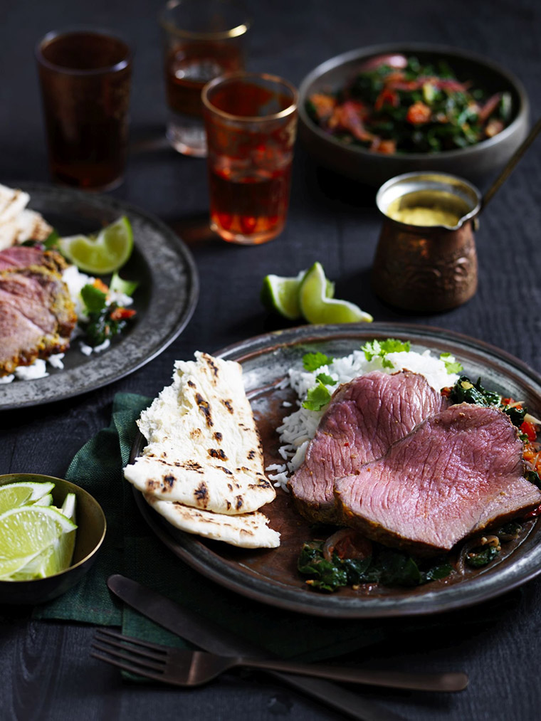 Indian spiced yoghurt-roasted Aussie flat iron