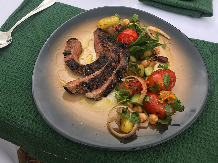 Sear both sides of steak over high direct heat, with grill lid open for 3-5 minutes, until medium rare and a nice exterior crust formed. Remove steak from grill and rest under tin foil tent for 5 minutes before slicing against the grain. Plate steak alongside salad and garnish with mint and parsley.