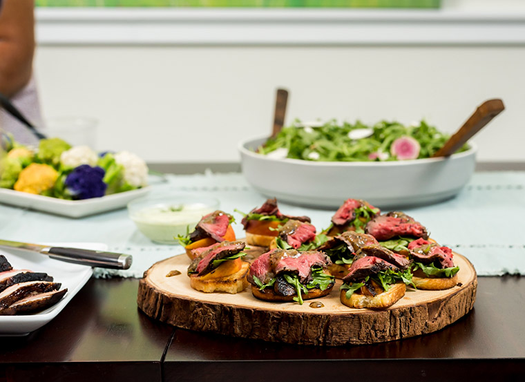 First-of-the-season peaches get a flavor boost on the stove, paired with peppery arugula and seared Aussie grassfed beef…all atop crunchy toast.