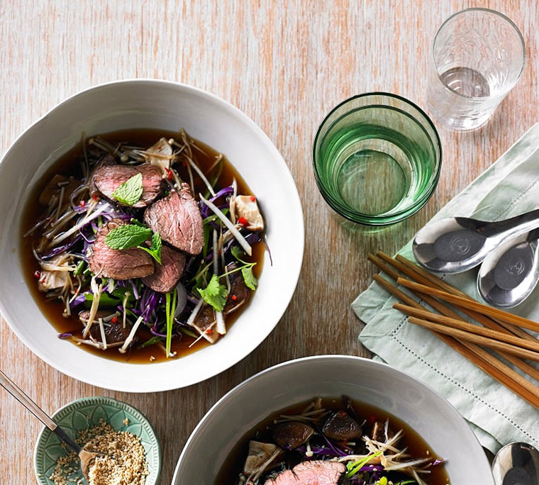 To serve: Divide slaw among plates and place in a mound in the middle of each main size bowl plate. Scatter the edges of the plate with the mushrooms and top with finely carved/sliced beef rump; pour over broth, serve immediately.