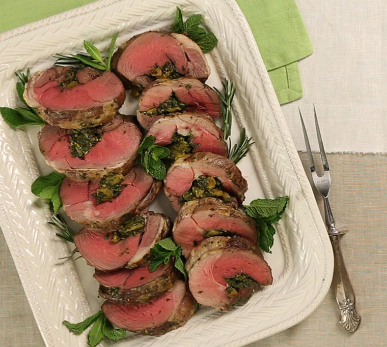 Rolling the lamb around the filling means you get some of those bright flavors in just about every bite. For the best flavor, stuff the lamb the day before you roast it. Garnish the platter of lamb with some of the same herbs from the filling, if you like.