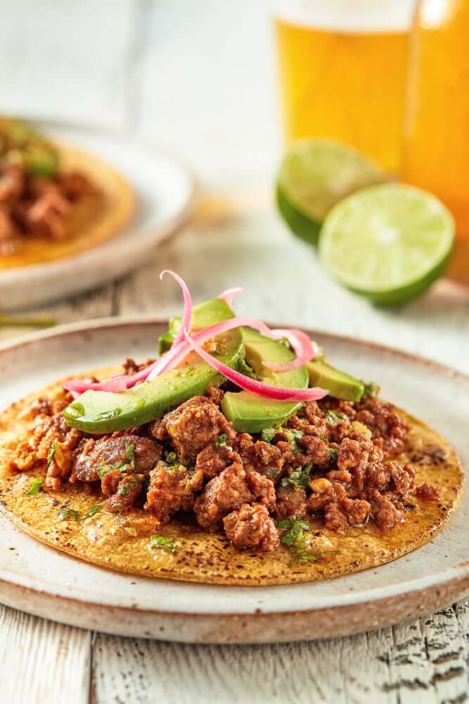 Season to taste and remove from heat to assemble taco with avocado and red onion as a garnish.