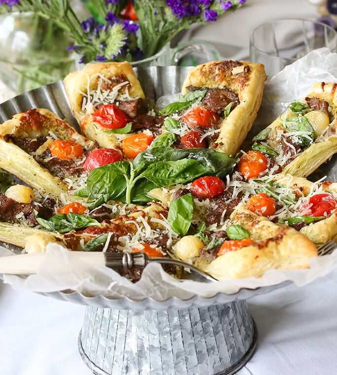 A delight for Spring brunch with pops of juicy roasted cherry tomatoes, scrumptious pesto, airy puffed pastry, and tender Australian lamb.