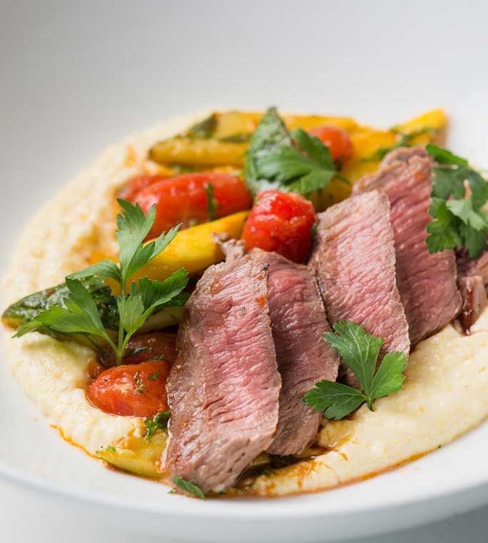 Place a large spoonful of the polenta on each plate. Place the sautéed vegetables on top of the polenta. Lay the sliced lamb on top, garnish with cherry tomatoes, and drizzle with some olive oil.