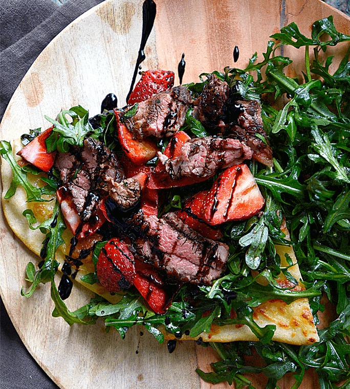Remove the pizza and top with about half of the arugula. Add the strawberries on top. Then place the sliced lamb on the pizza. Drizzle with balsamic glaze. Serve immediately with additional servings of arugula for ‘salad.'