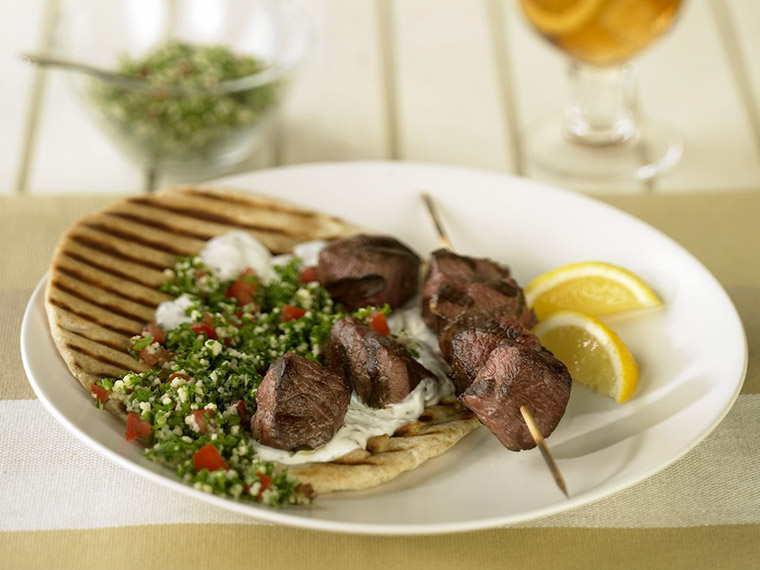 Toast the pitas lightly on the grill until just warmed, and top with the lettuce and tabbouleh or tomato. Remove the lamb from the skewers and place on salad. Drizzle with the yogurt and wrap firmly into a roll.