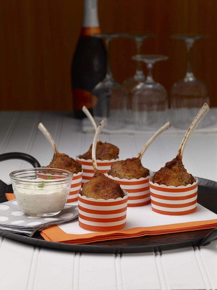 Frenched rack of Aussie lamb cut into delicate little chops, breaded, pan-fried and garnished with a cooling cilantro yogurt work well as appetizers or passed hors d’oeuvres.