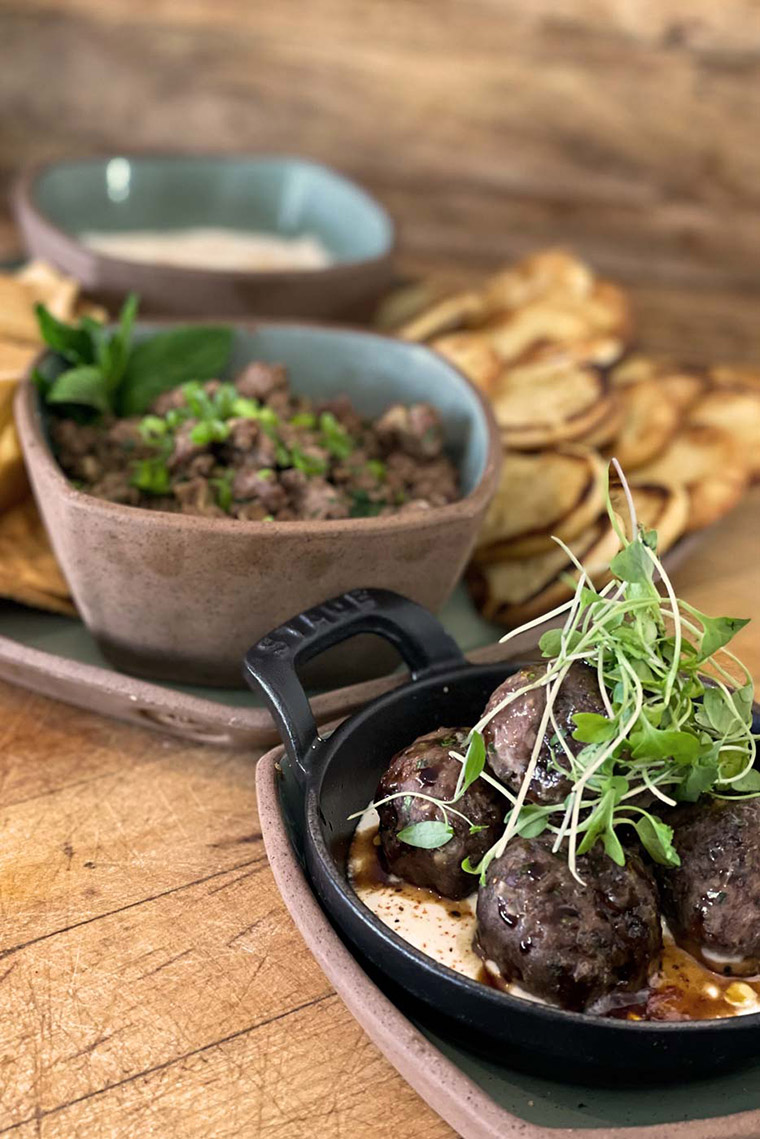 - To serve, swoosh whipped feta onto a long platter. Add meatballs and sprinkle with mint or microgreens. Serve with pita chips.