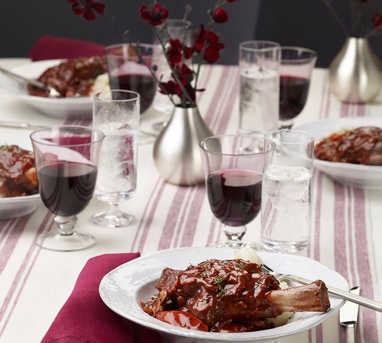 Season the lamb generously with salt and pepper. Sear the shanks on all sides until brown. Remove them and set them aside. Add the onions and carrots to the pot and let them sweat over low heat for 10 minutes, or until the onions are soft and a bit browned. Season with salt and pepper. Add the garlic and cook for 1 minute. Stir in the tomato paste, then pour in the wine and let the mixture simmer for 2 to 3 minutes to cook off the alcohol. Add the stock and herb bouquet. Add back the lamb and bacon, making sure the lamb is covered with stock. Bring to a boil and cook for 5 minutes.