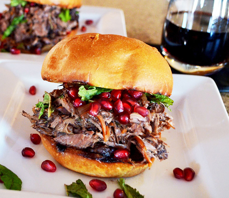 For the sandwich: Brush brioche buns with butter and toast slightly. Toss pulled lamb in port wine sauce. Pile pulled lamb on bottom bun. Top with fresh pomegranate arils and chopped mint. Top with top bun.