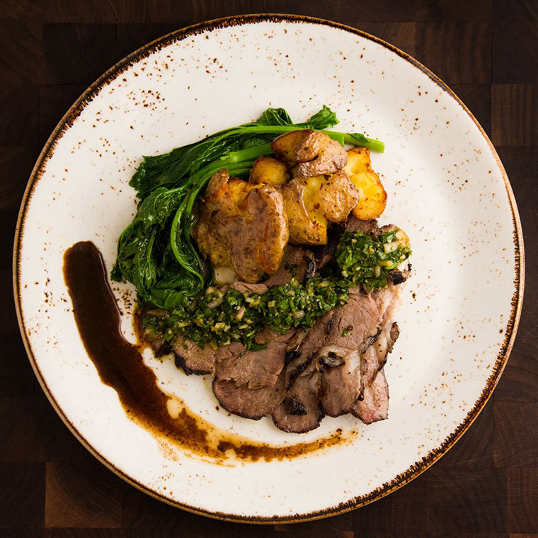 Slow roasted Australian lamb shoulder with roasted potatoes, rapini & gremolata