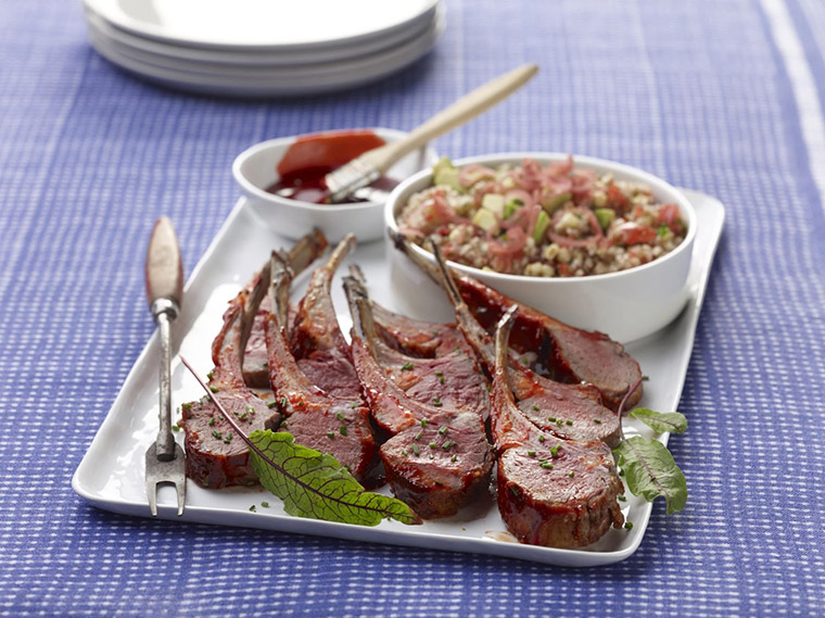 A simple grain salad with buckwheat, fresh herbs, summer corn and heirloom tomatoes gets much sexier with champagne vinaigrette and lamb chops glazed with honey and spicy korean gochujiang, then kissed on the grill.