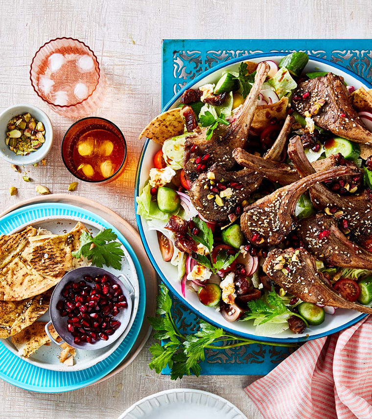 Serve chops with salad topped with parsley, pistachios and pomegranate seeds.